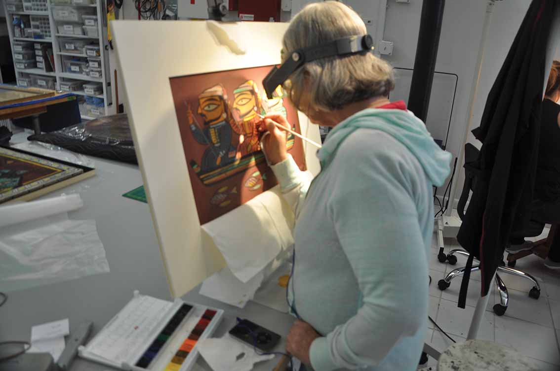 The treatment of the Jamini Roy paintings has been an arduous process that went on for the past six months. Roy used a variety of organic materials, using paint created from locally found rock-dust, tamarind seeds, and mercury powder. Apart from canvas on board, he would also paint on woven palm fibre mats, a traditional canvas used in Bengali folk art. Despite the transient nature of these materials, the restoration team was able to effectively conserve the painting by dry cleaning methods, consolidating lifting and peeling paint and reinforcing the canvas support.
