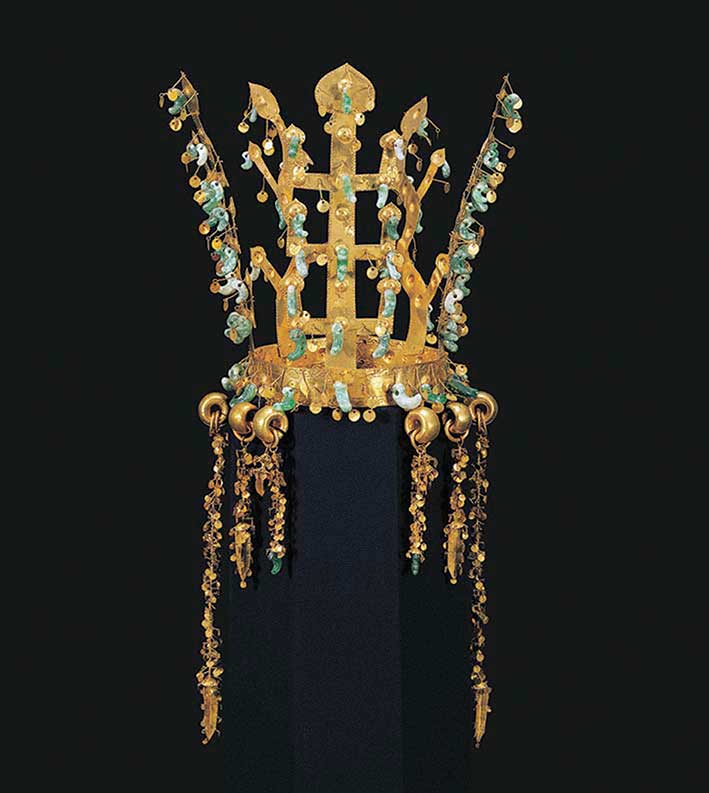Silla’s history and culture are largely known today through material unearthed from elaborate burial sites. Located in modern-day Gyeongju (the old Silla capital Geumseong), the tombs of kings, queens, princes, royal relatives, and other elites are the dominant sight in the city. From the time of their construction, as symbols of political authority and cultural grandeur, they have dominated the landscape. Some of the most famous archaeological finds from this period are the gold tomb objects that were mainly excavated in the 20th century. The earliest gold objects from Silla date to the last quarter of the 4th century, with the most spectacular and best-known objects being the gold crowns dating to the 5th to 6th centuries.
